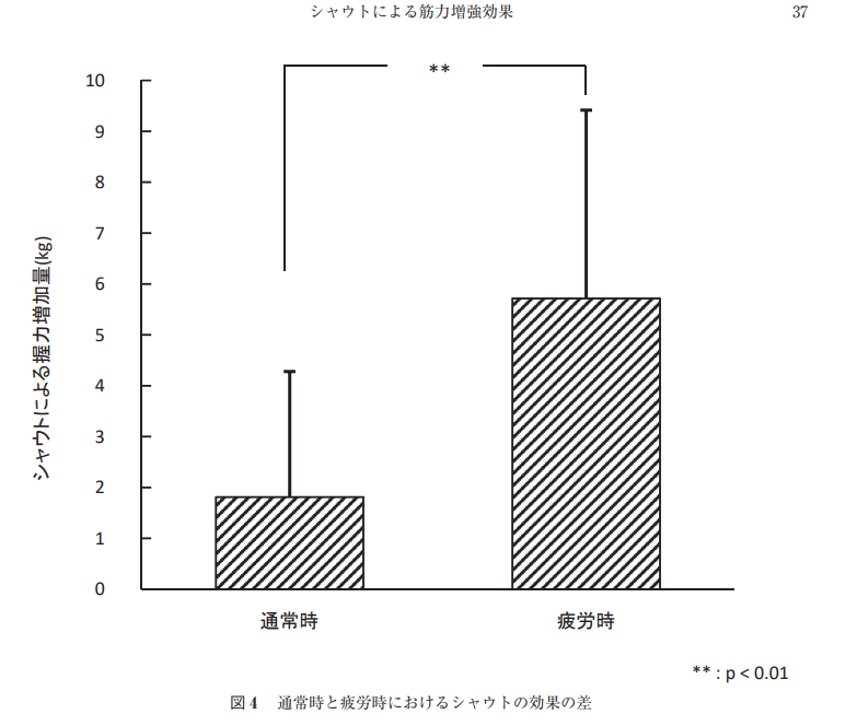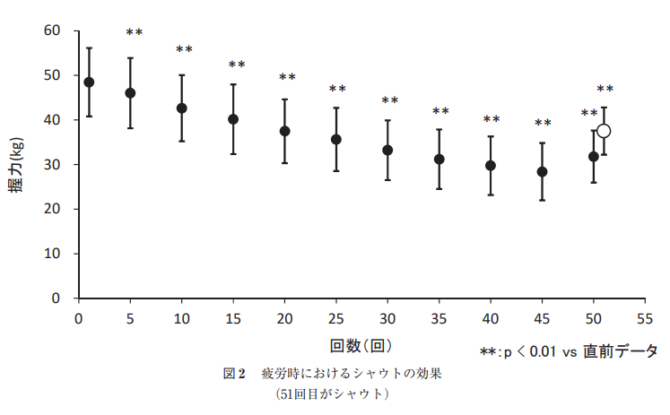 先ほども述べたようにアスリートはシャウトします.これは経験的に声を出した方が力が入ることを知っているからですが,実はこのことについては数多くの研究がなされて科学的にも実証されています.