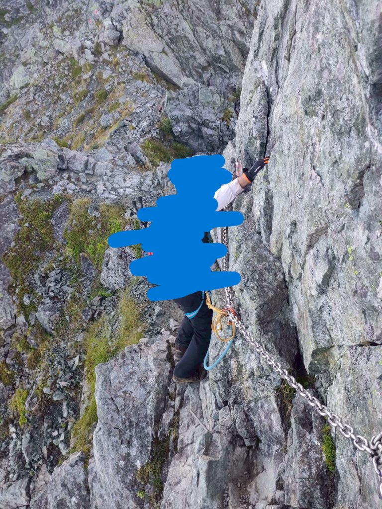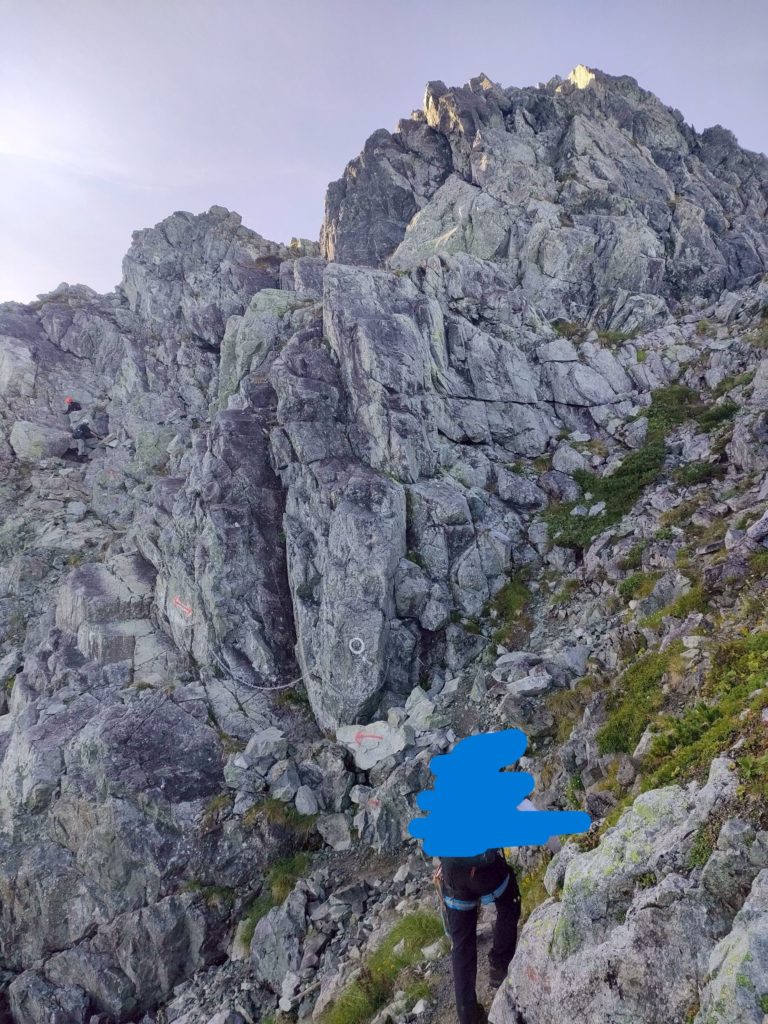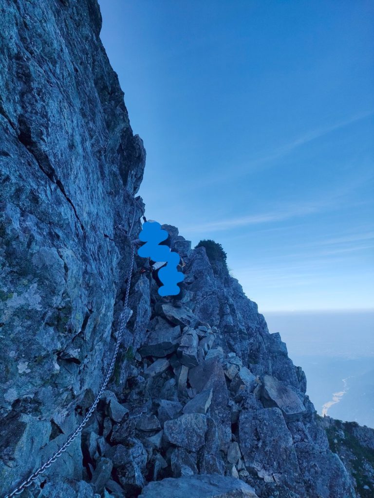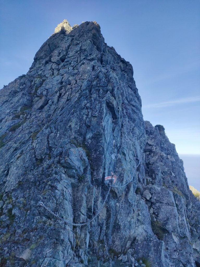 ここからが核心だと遠めにみてもわかるような威圧的な岩峰が我々をまっています.岩峰を巻くように池ノ谷側にできている岩のバンドを鎖も使いつつ進んでいきます.高度感はありますが足場は意外としっかりしておりしっかりとした三点支持ができていれば問題な通過できるはずです.