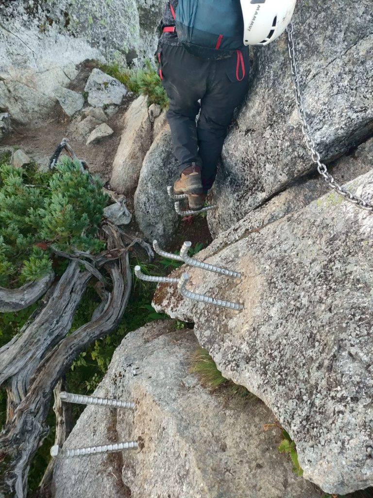 最後の最後に訪れるのがカニのはさみと呼ばれる個所で,さらに細いバンドを進んでいきます.最後の一歩は水平に打たれた鉄の杭を足場に越えていきます.