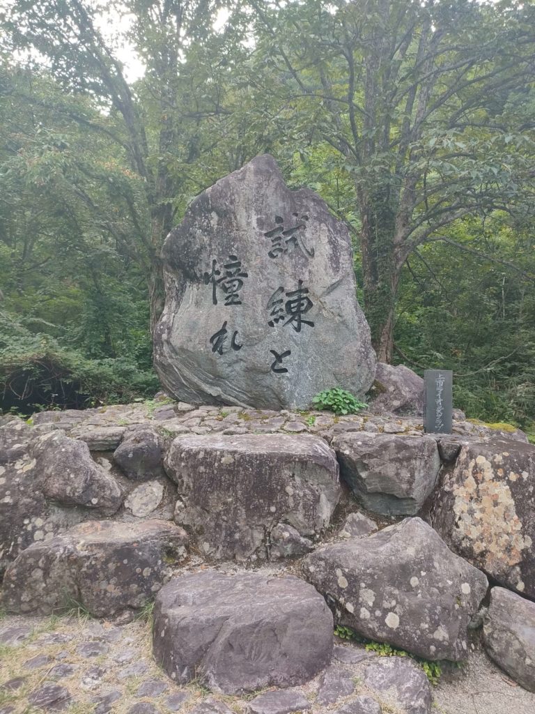馬場島荘の駐車場に車を止めしばらく歩くとすぐに「試練と憧れ」の石碑があります.ちなみに馬場島のキャンプ場の水は沢の水で公式には飲用不可となっているので事前に水を用意しておくことをおすすめします.一応煮沸すれば問題なく飲めると思います.