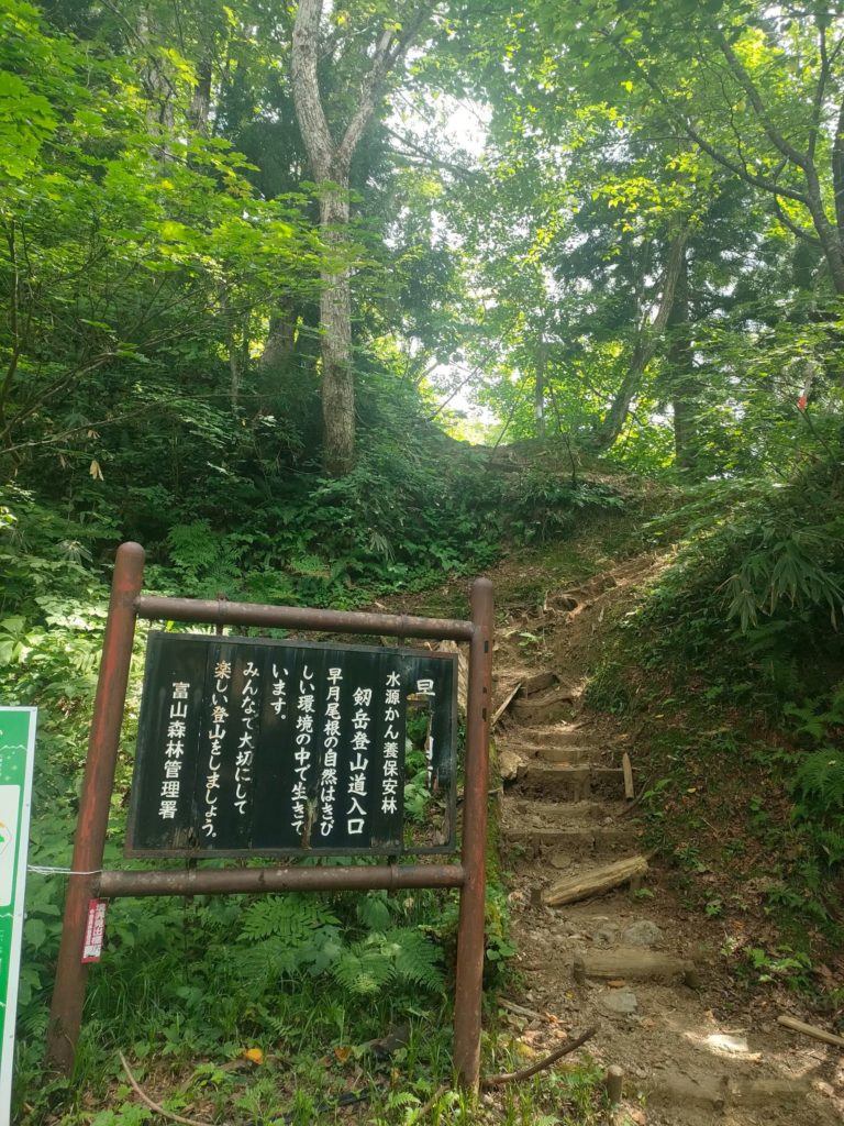 石碑のさらに先には看板が立っておりここからいよいよ早月尾根の登山がはじまります.北アルプス三大急登の名の通り出だしから急登ですが道は整備されています.